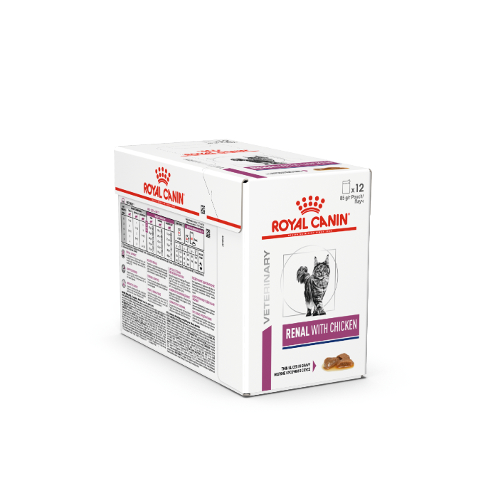ROYAL CANIN® Renal with chicken thin slices in gravy is a complete dietetic feed for cats formulated to support renal function in the case of chronic renal insufficiency.