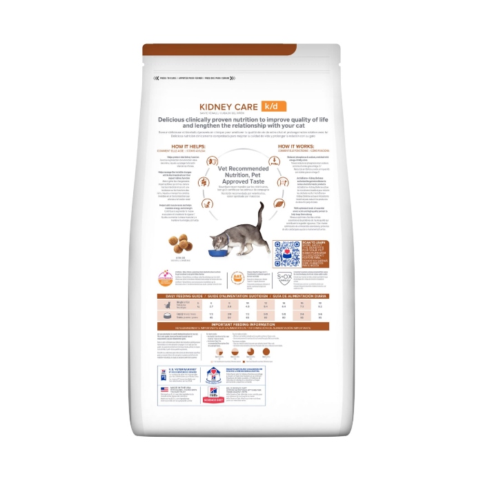 Hill’s nutritionists and veterinarians developed Hill’s Prescription Diet k/d clinical nutrition to help protect your cat’s vital kidney function, enhance appetite and increase food intake. This dry food is made with chicken and has an irresistible taste that your cat will love. In fact, the nutrition of Prescription Diet k/d is clinically proven nutrition to improve & lengthen quality of life.